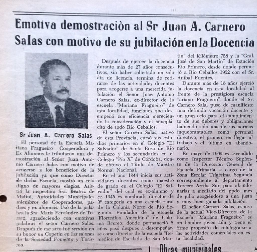 Participó en las gestiones para la construcción del edificio de la Escuela Mariano Fragueiro logrando la partida para su edificación.