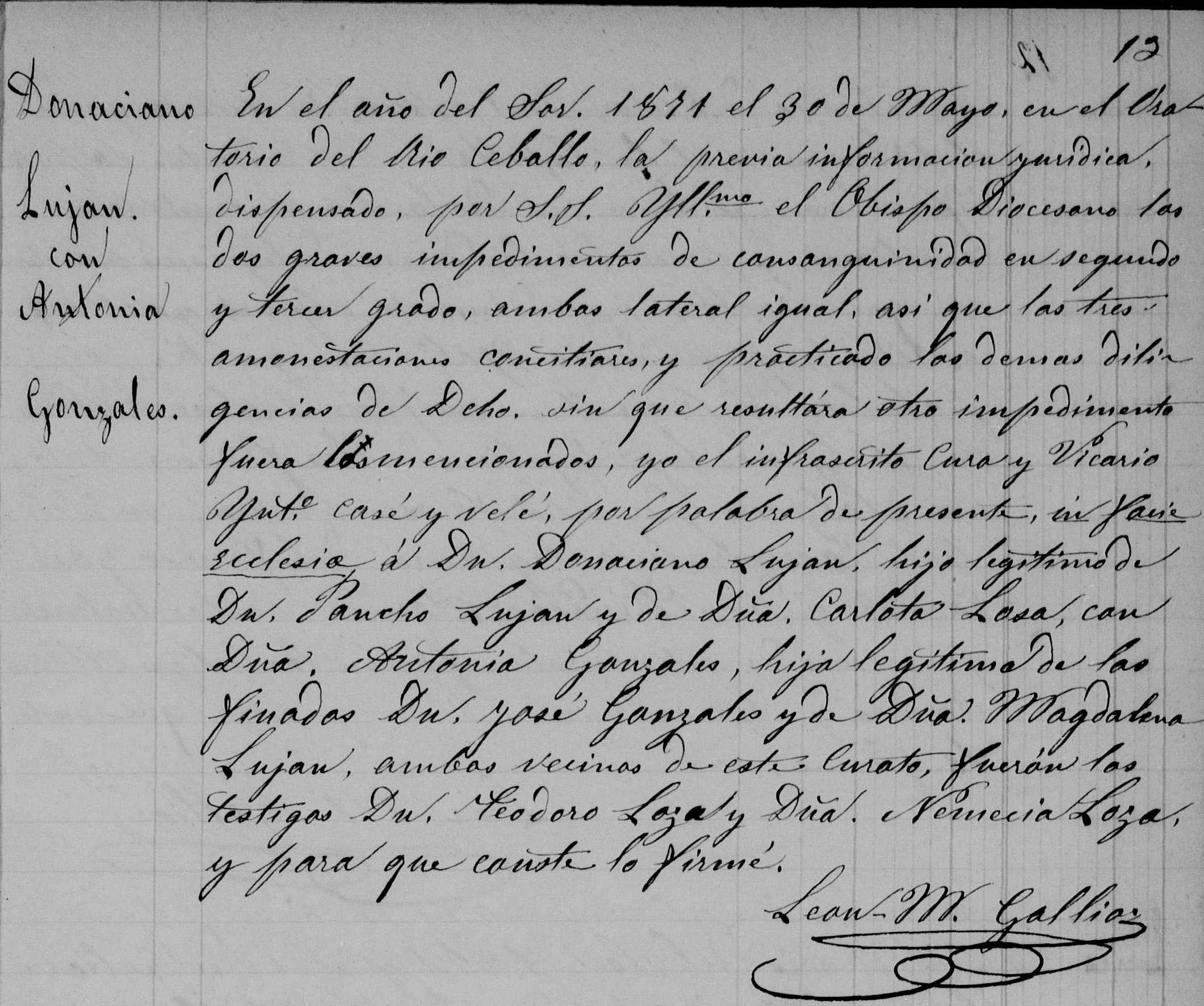 Casamiento de Donaciano Luján con Antonia Gonzales en el oratorio de Río Ceballos en el año 1871. Donaciano es hijo de Pancho Luján, primer maestro de Río Ceballos.
