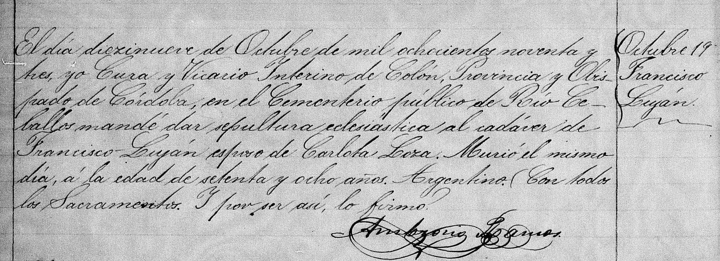 Acta de defunción de Pancho Luján, enterrado en el cementerio público de Río Ceballos en el año 1893.