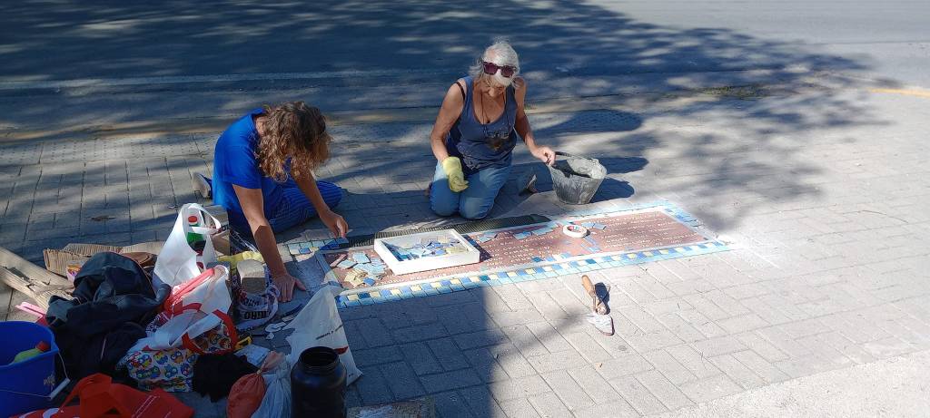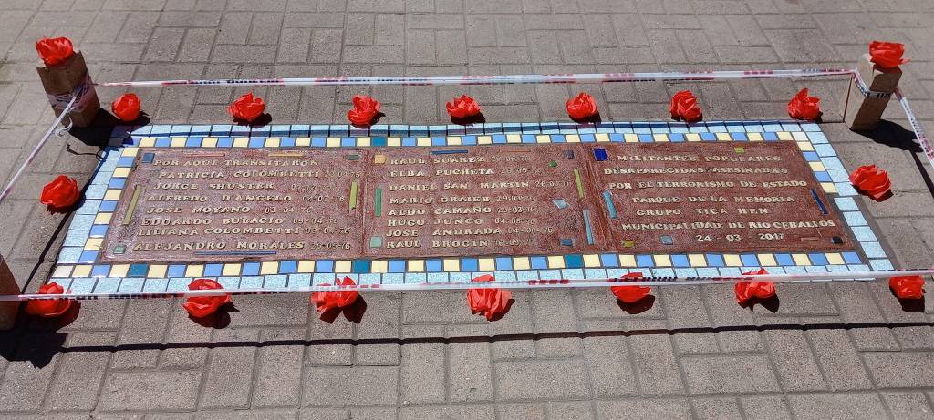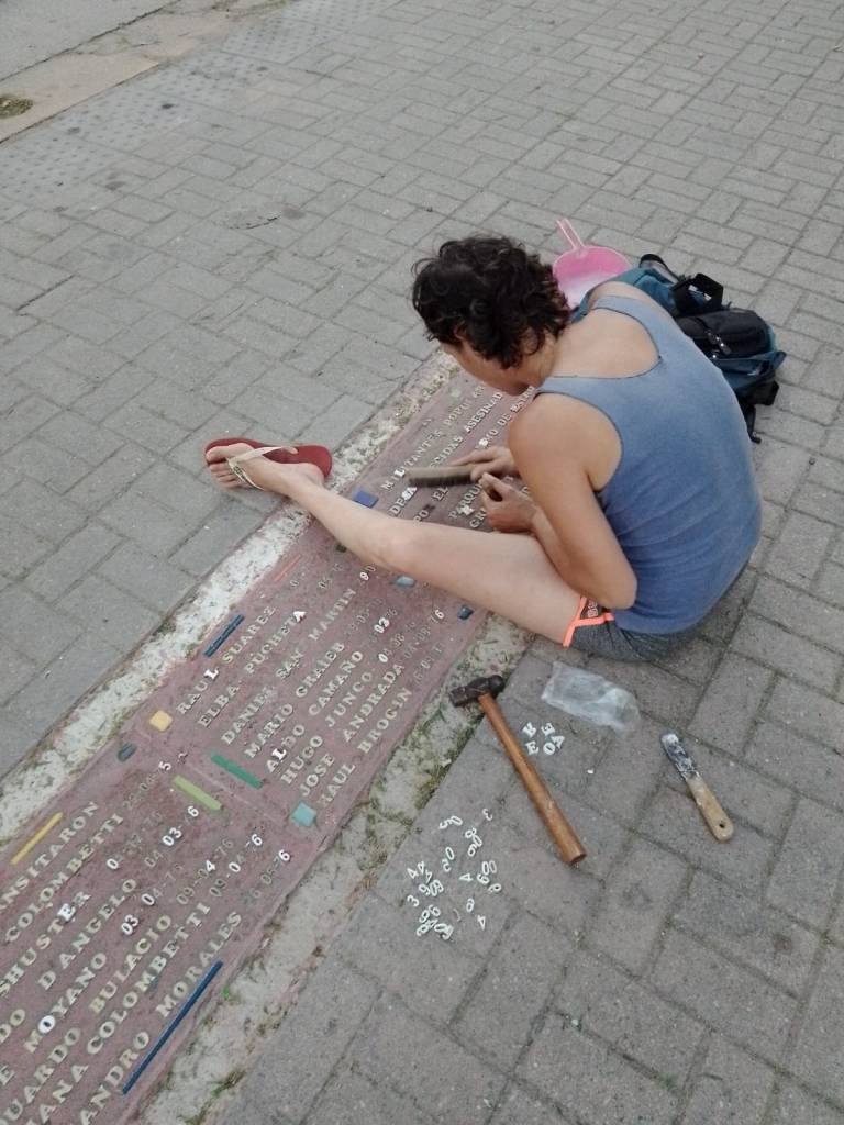 Restauramos las Baldosas por la Memoria que se encuentran en la vereda de la Capilla Histórica. Cambiamos los mosaicos de la guarda y repusimos las letras faltantes o deterioradas que nos fueron enviadas desde Buenos Aires por Barrios X Memoria y Justicia.
